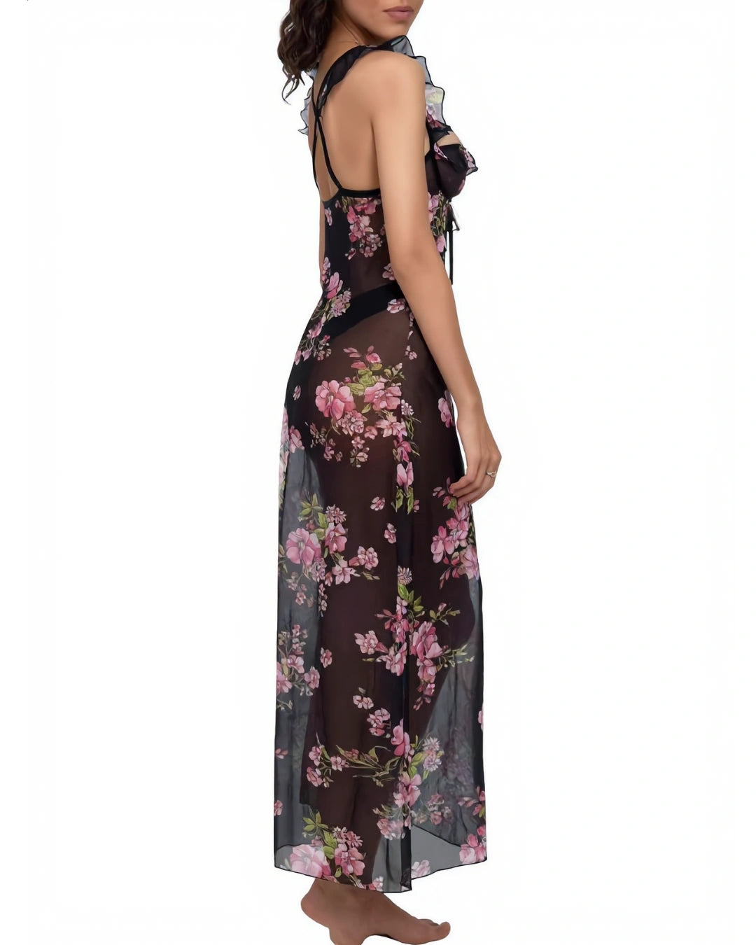 Immerse yourself in romance with this captivating sheer floral nightgown. This floor-length black mesh dress is adorned with a vibrant pink rose print, offering a striking contrast that is both elegant and sultry. Designed with a structured bustier-style bodice featuring a cute front tie, wide straps that cross elegantly at the back, and a flowing skirt with a ruffled hem, it creates a dreamy silhouette perfect for special nights.