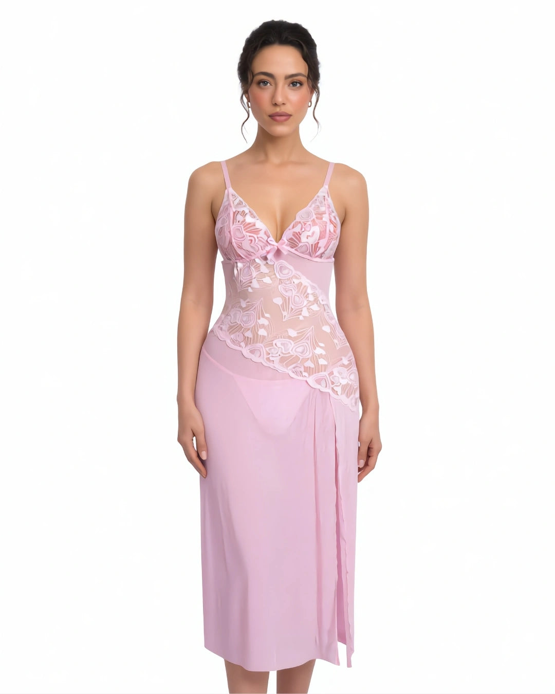 Lingerie Gown – Seravelle is a sheer lingerie gown designed with a fitted lace bodice and a softly flowing skirt. The upper section features floral lace cups with thin shoulder straps and a semi-sheer mid-panel that defines the waist. The gown flows into a lightweight skirt finished with a high side slit, creating an elegant and feminine silhouette. This piece is ideal for intimate lingerie and nightwear styling.