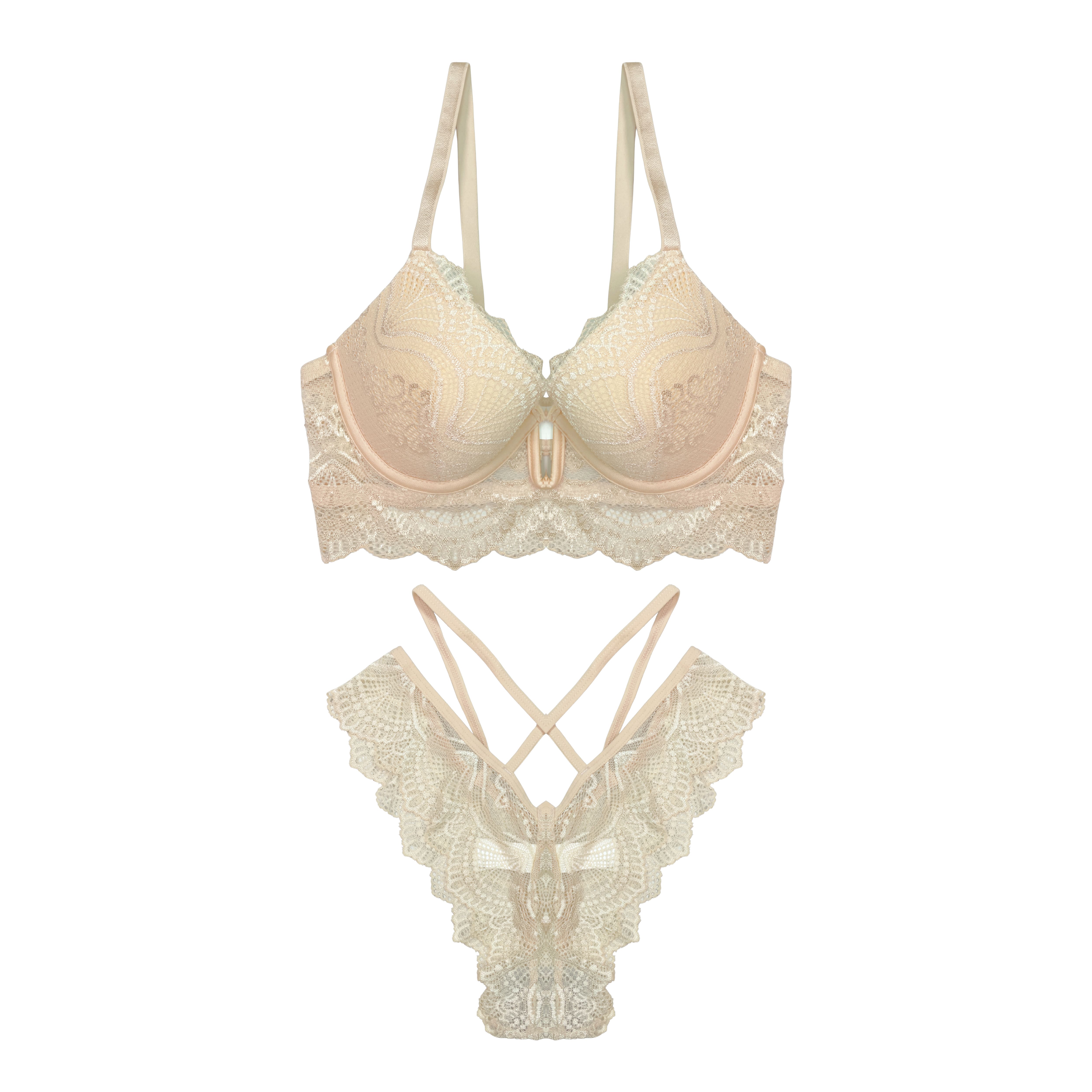 Sajiero Blush Mirage is a soft nude lingerie set designed to highlight your natural beauty. The delicate lace details and stylish cross-strap panty give it a modern yet elegant vibe. The lightly padded bra offers gentle lift and support, making it perfect for everyday wear with a touch of charm.