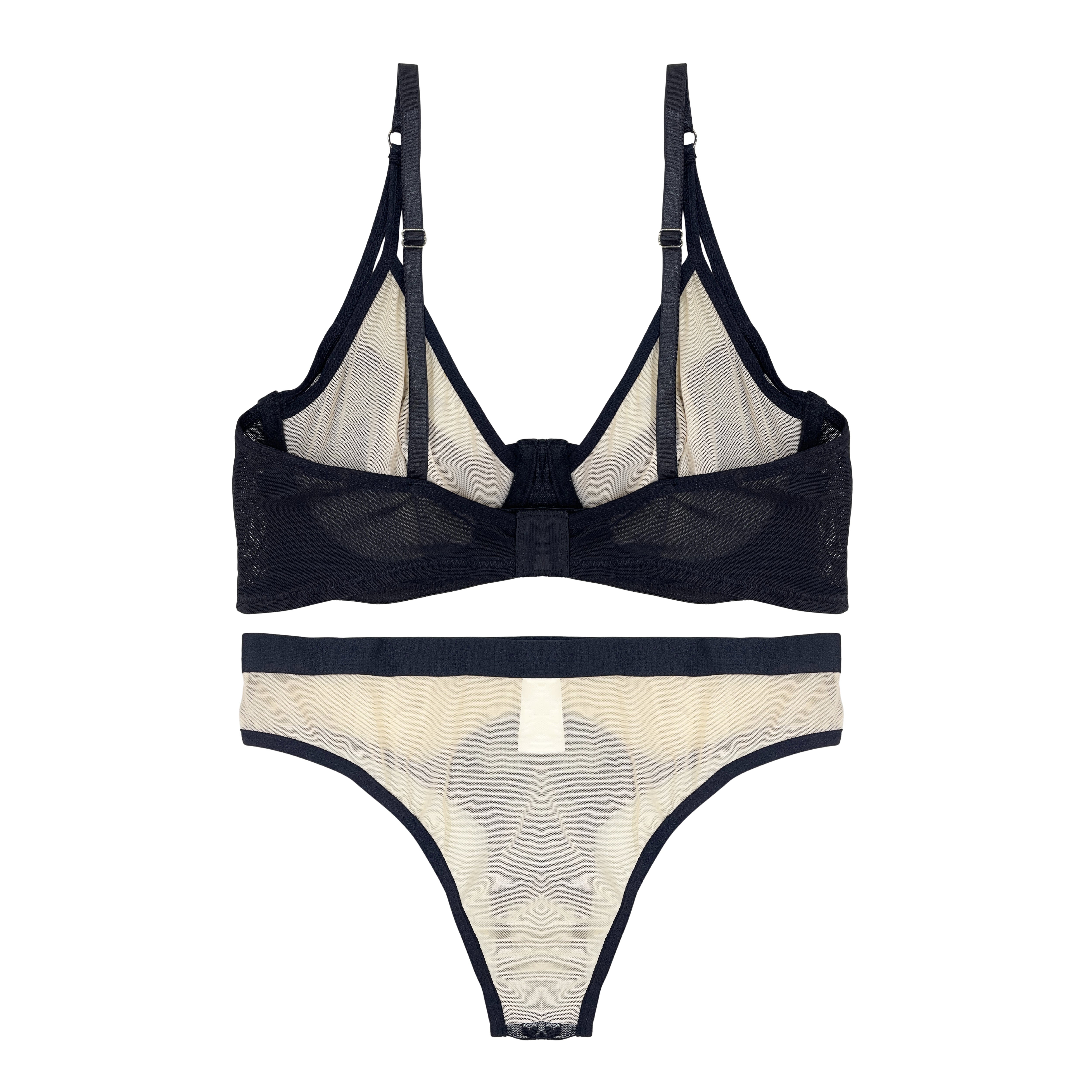 A masterpiece of contrast and confidence — the Sajiero Obsidian Veil Set features sheer nude mesh and intricate black lace for a bold, sculpted look. With a non-padded underwired bra and coordinating mid-rise panty, this set blends delicate femininity with striking design.